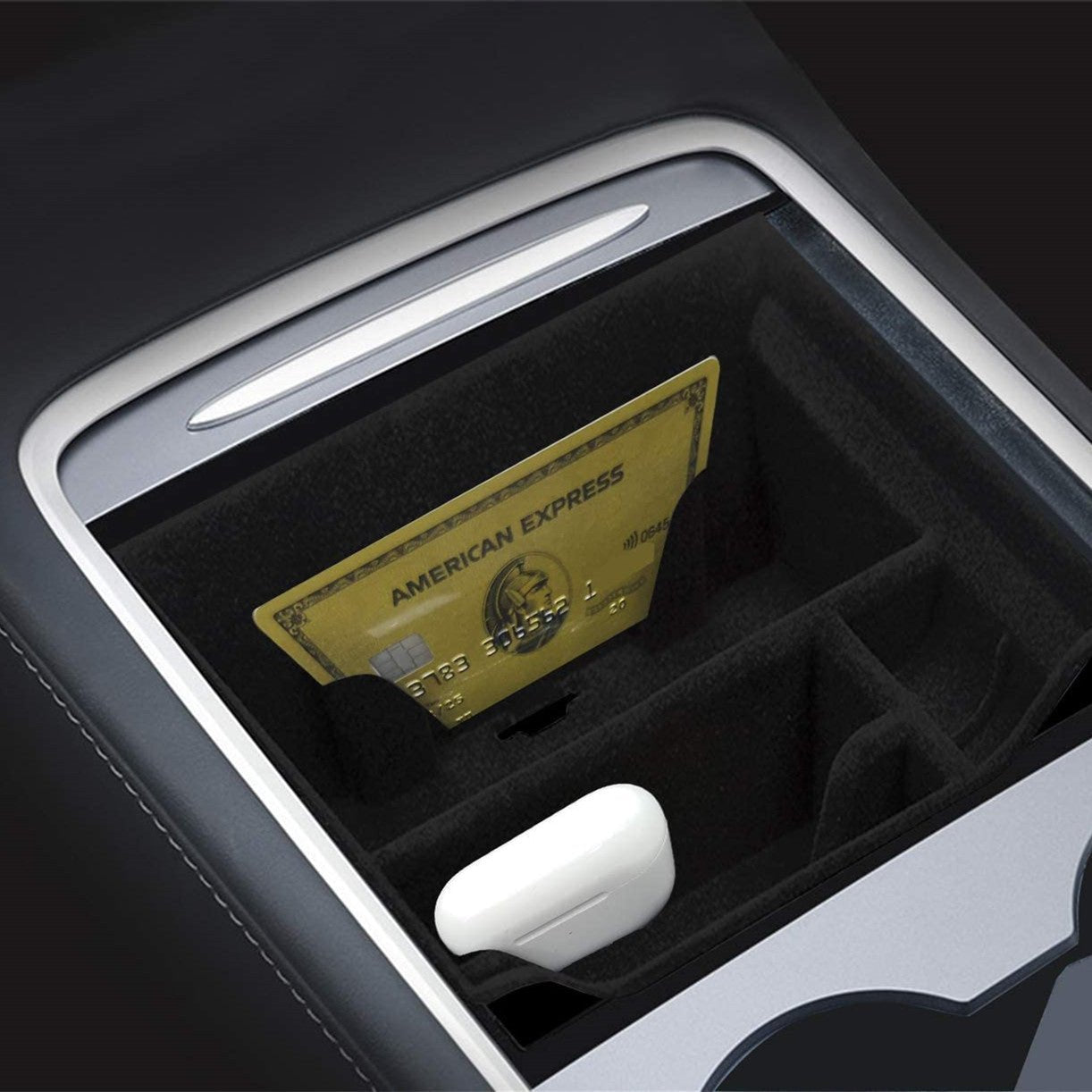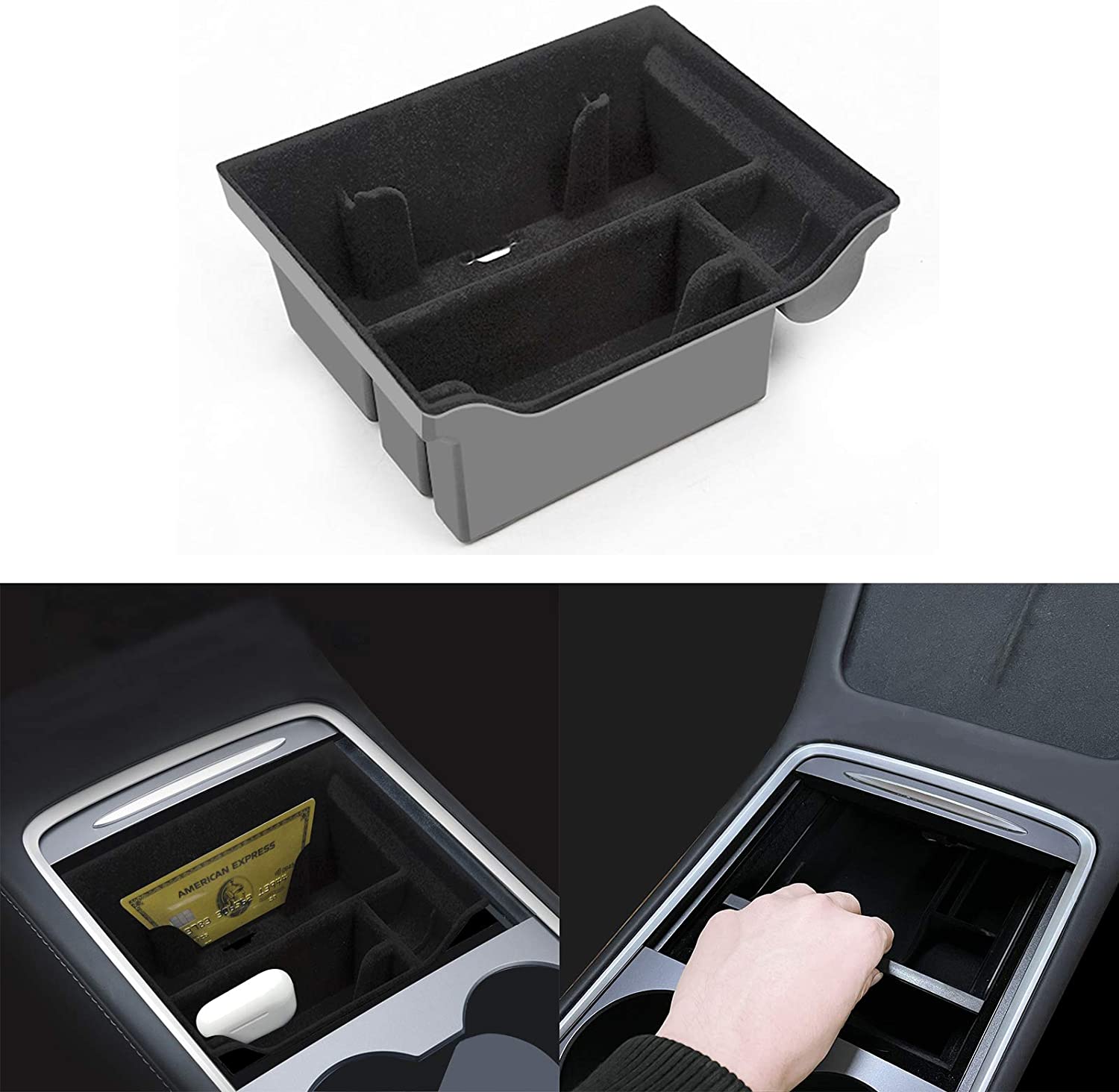 - 【Increased Storage Space】The Model Y center console organizer has four storage areas. which are convenient for storing different types of items. especially small items. You can store your phone. sunglasses. Tesla key cards. cigarettes. lighters. lipstick. coins. and more.