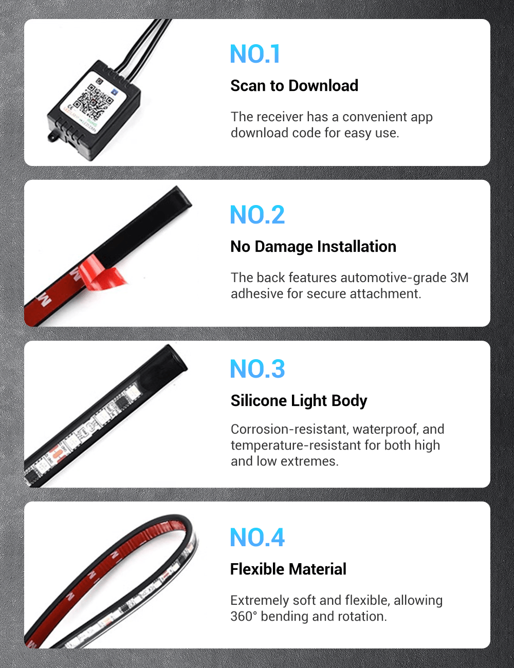 - 【Durable Silicone Construction】: Crafted from premium silicone, these lights feature waterproof and corrosion-resistant properties while withstanding extreme temperatures. The flexible and durable light strips ensure they won't break easily.