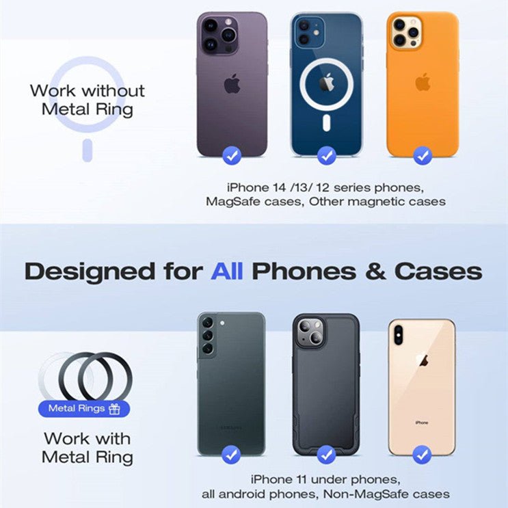 【Wide compatIbillty】: The universal spherical ball head is compatible with any phone mount (no magnetic base required). It works with iPhone and newer models, MagSafe series phones, and any phone equipped with a MagSafe case. Its design incorporates magnetic self-aligning technology that automatically attaches to iPhones.