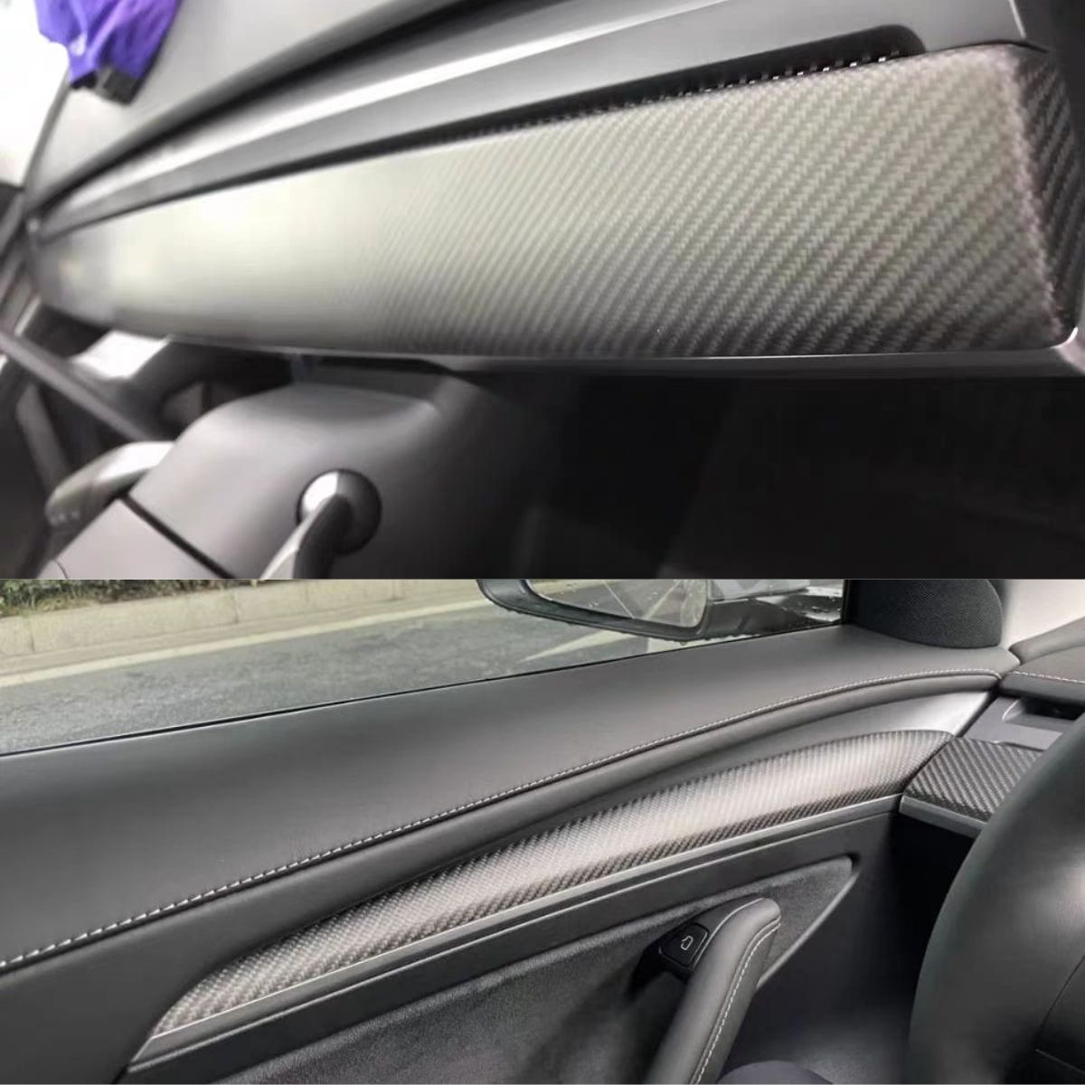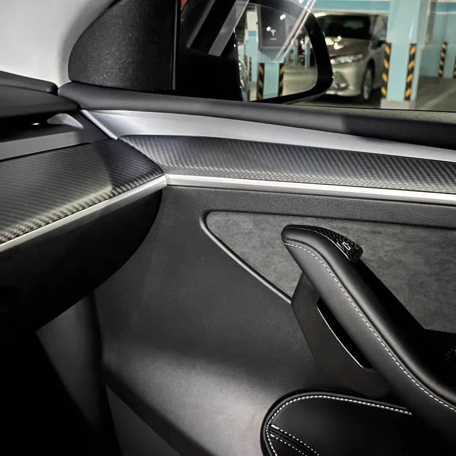 Tesla released a "refreshed interior" for Model 3 and Model Y (Jun.. 2021+) that includes revised wraparound door panels that are an extension of the wooden and white dashboard. Many owners opt to go with a more elegant and sleek carbon fiber interior.