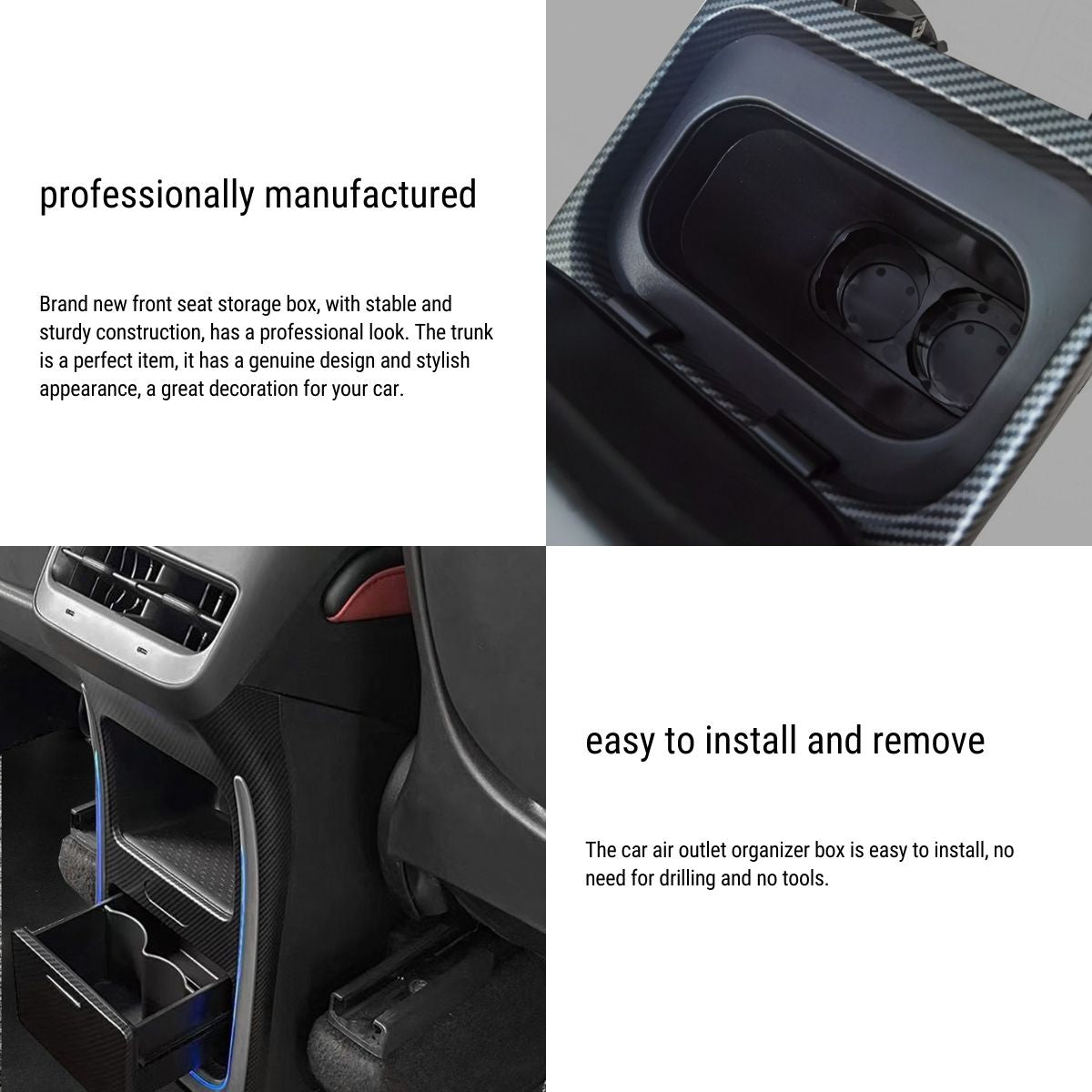 【Professionally manufactured】: Brand new front seat storage box. with stable and sturdy construction. has a professional look. The trunk is a perfect item. it has a genuine design and stylish appearance. a great decoration for your car.
