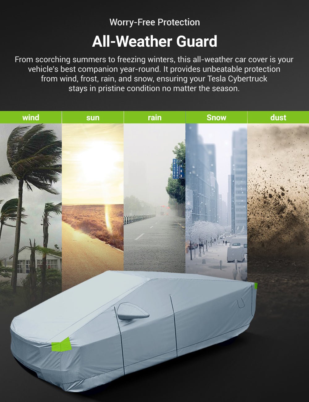 - All-Weather Defense: This cover is your Cybertruck's defender against sun. snow. frost. and rain. It's built to withstand the harshest conditions. keeping your car safe and looking its best.