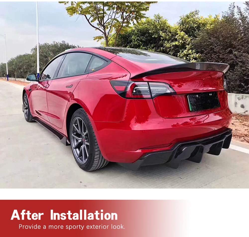 Tesla Model 3 rear diffuser adds a deeper and more aggressive look to the rear end of your car. It increases the rear downforce and makes it more stable at higher speeds. The Tesla Model 3 diffuser can enhance the car's sporty performance and make the car more dynamic.It is solid carbon fiber and it mounts securely to the lower part of your rear bumper.